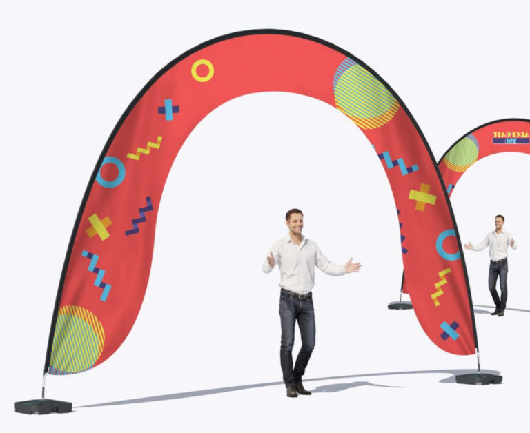 Arche d’entrée publicitaire personnalisée de longueur 3.80m par 2.40m de haut (5.50m par 3.15m pour la ARCHTEXT 550). Structure composée de mâts en fibre de carbone qui s’assemblent les uns dans les autres. La voile s’insère dans le mât comme un beach flag puis on fixe le mât sur les pieds. Impression recto sur maille bloquée polyester 115g/m², visible au verso par transparence. Fourreau noir en Oxford 300D. La structure se monte comme un oriflamme et se fixe aux mêmes pieds (en option) que les oriflammes classiques.