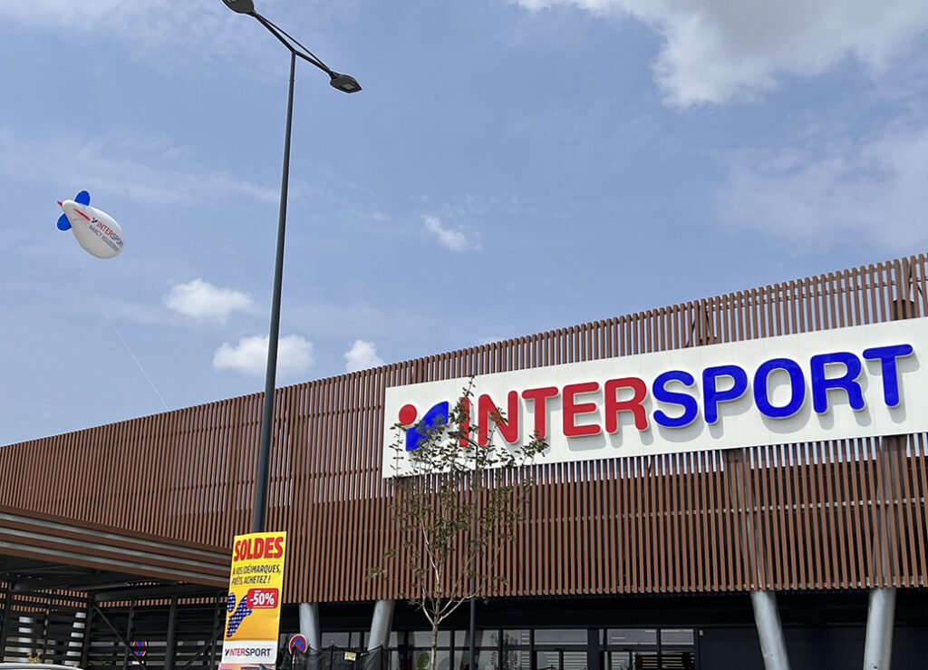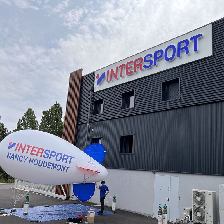 Pour les Soldes du Mois de Juin et la rentrée de septembre, Intersport nous a commandé un dirigeable publicitaire PVC de 6m gonflés à l’hélium.