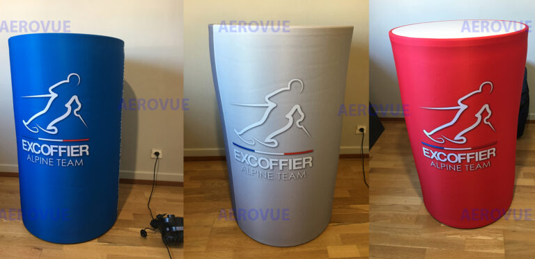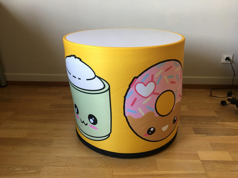 Nos Poufs, fauteuil et canapés : gonflable à air captif . Les produit sont constitués d’une structure gonflable recouverte d’une toile polyester imprimée en sublimation all-over. Le montage s’effectue en 1 minute. Le visuel est fabriqué dans une toile 100% polyester traité anti-feu norme B1.